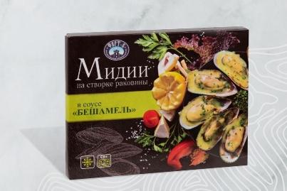 В упаковке 200гр - 8 мидий на ракушке, приготовленных в соусе Пармезан, Бешамель или Песто - выбирайте по своему вкусу. Производитель ООО "Аквапродукт", цена 599 руб.